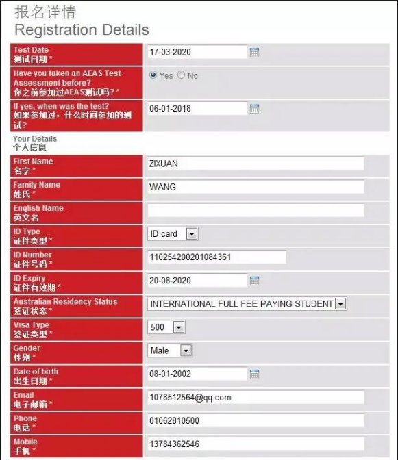 在进入填写表格环节前,考生要先选择考试城市和考试日期,也可以通过页面中的城市列表查询所有城市的考试日期。以下是AEAS考试注册详情(下方注册信息以一位在读Year 8普通学校学生为例填写)。