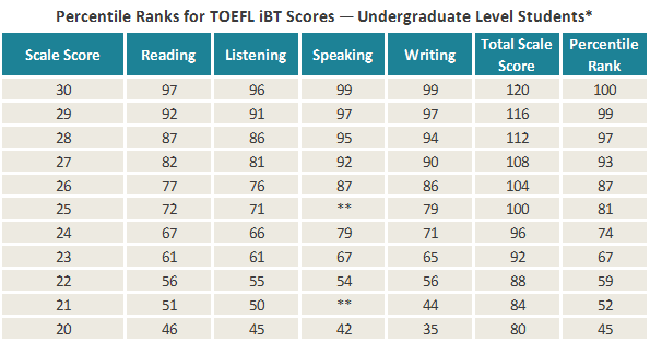 本科申请群体托福分数百分等级对照表