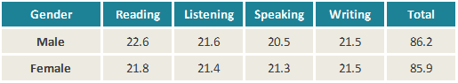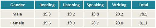 如下表所示,在出国读本科的托福?考生群体中,男性平均分是 78.5 分,女性平均分为 81.1 分。从听说读写四项横向对比来看,双方均在写作部分的表现,男性在听力部分表现较弱,女性则在阅读部分表现欠佳。