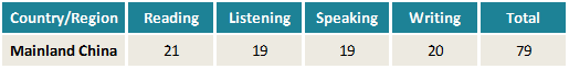 从报告中截取的这份数据中可以看出,中国大陆地区考生 2017 年度的平均分是 79 分,最擅长的阅读部分均分达到了 21 分,听说读写各项并无明显短板。