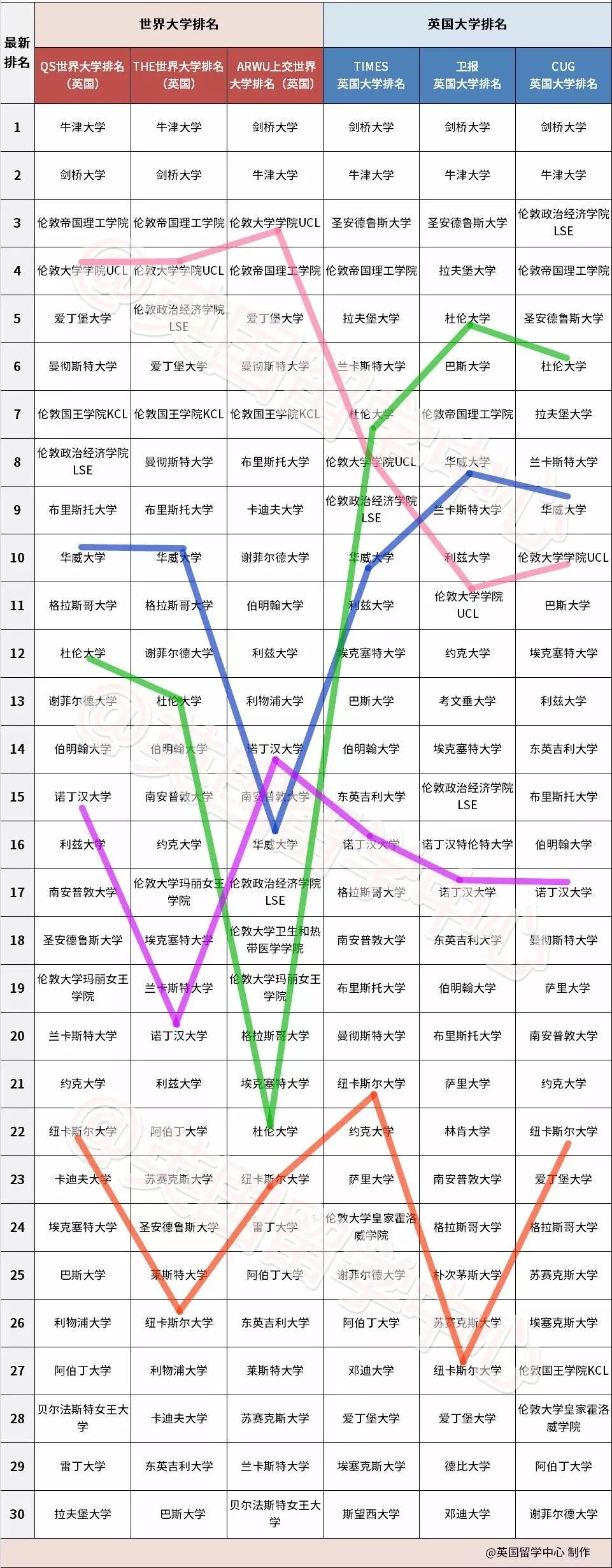 选取英国TOP30的大学进行横向对比,方便大家直观的了解一所大学在不同ranking中的排名走势。